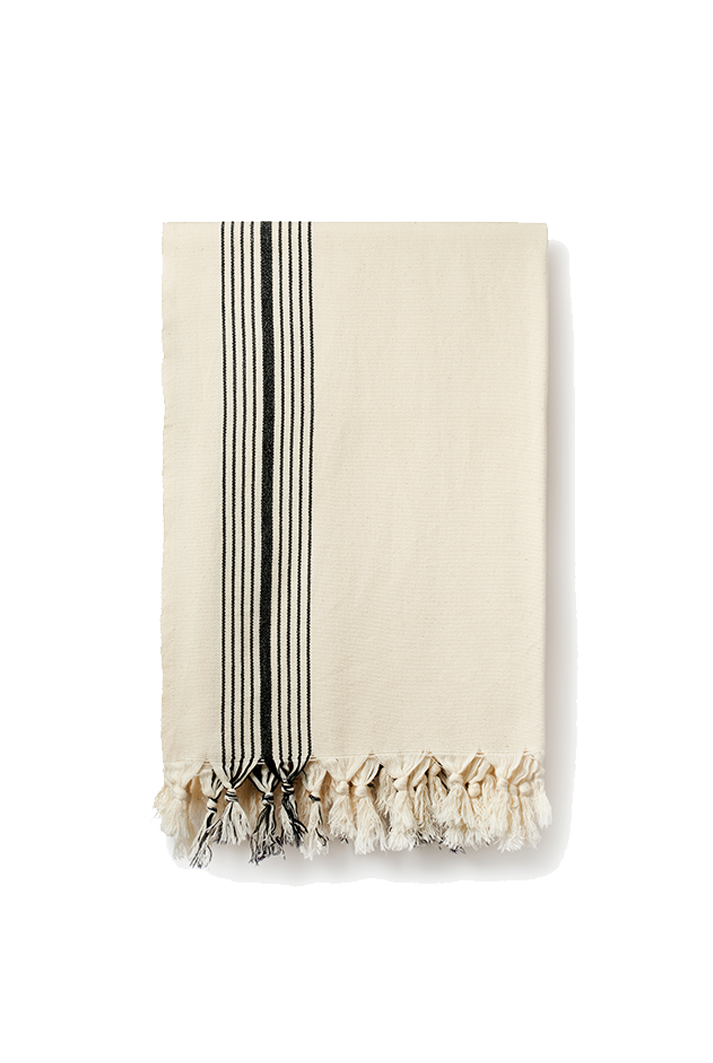 Vintage inspired the Bergama is a beautifully simple flat woven cotton peshtemal traditionally loomed in cream weft with black stripes. It is hand finished with a knotted fringe.