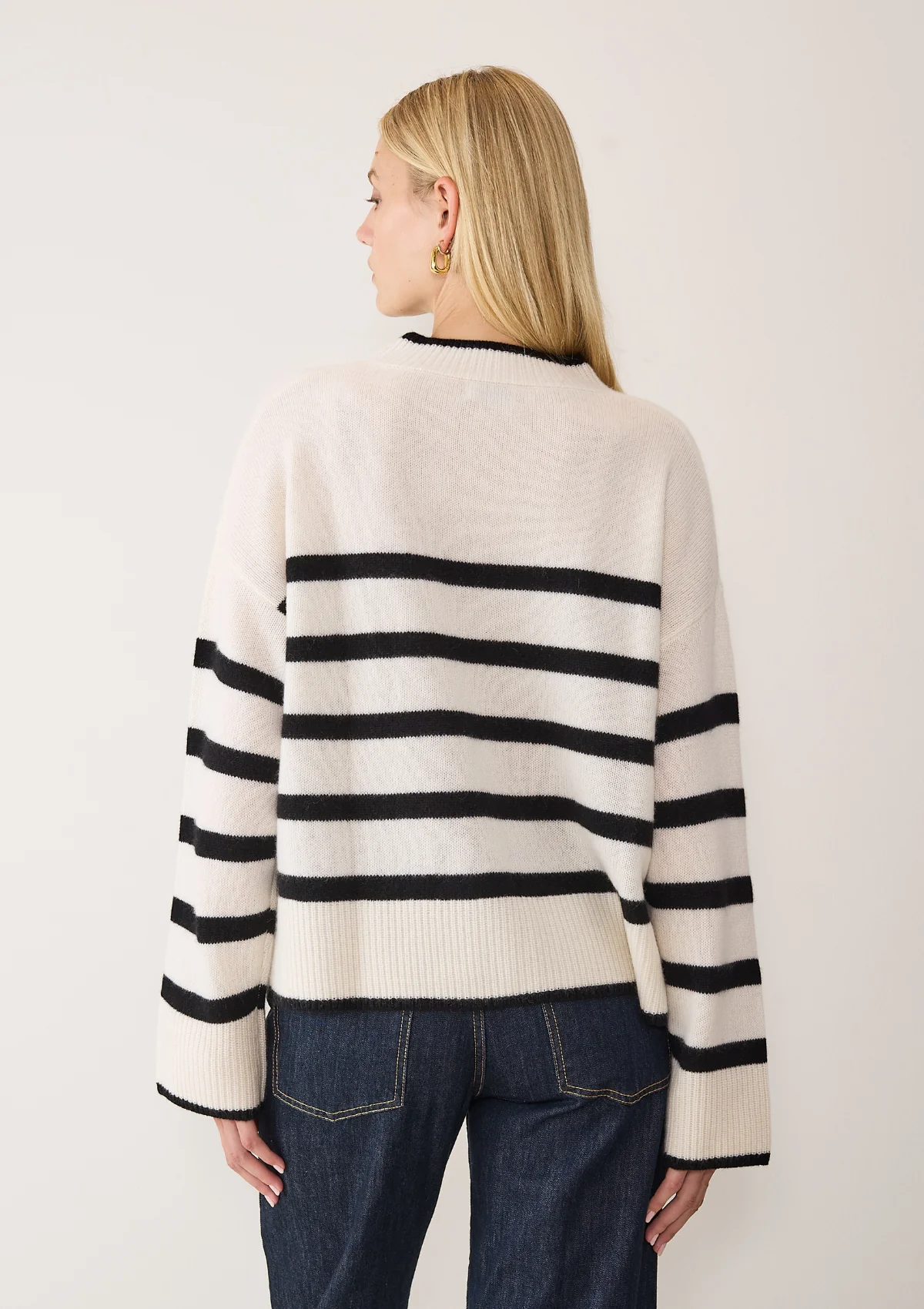 Nothing is cooler or easier to wear than monochrome stripes. Knitted in a heavier weight for the bright but still cold spring days this sweater is cosy and generously proportioned. With cardigan ribbed trims and a wide slightly high neck for a flattering sweater that you'll reach for time and again. Crafted from 100% Inner Mongolian recycled cashmere.