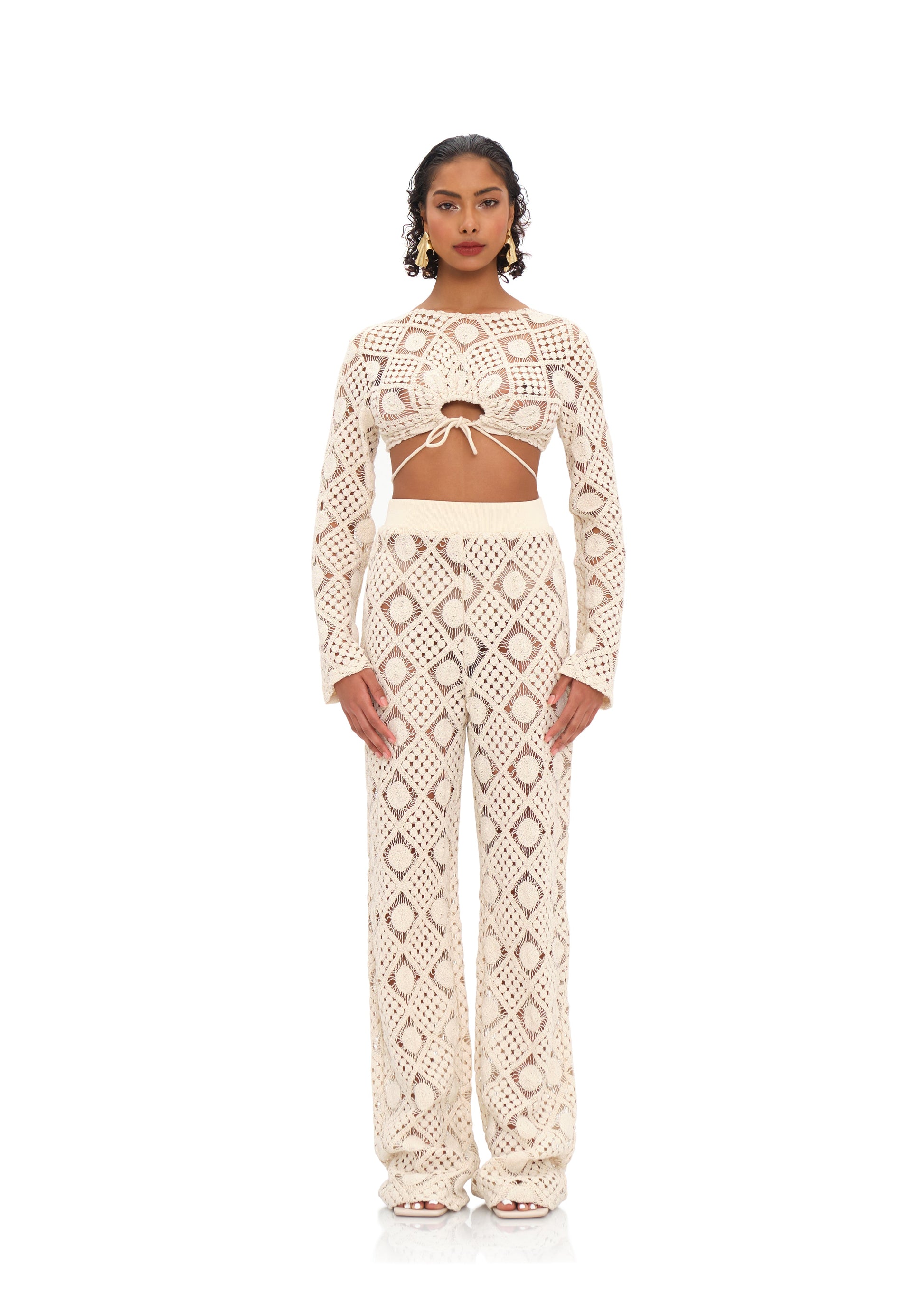 The HIRA high rise cover up crochet pants covers you up in a unique way. Left see through and unlined, it will give character to any piece worn underneath and vice versa. Pair it with the matching HIRA keyhole crochet crop top for the complete look.
