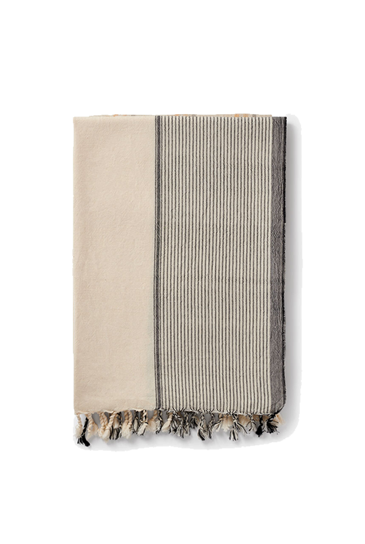 The Mete peshtemal is gently handwoven by master ateliers on wooden shuttle looms. A rustic peshtemal, the Mete comes in cream with subtle black pin stripes and trim and works well in modern rustic, boho and global modern interiors.