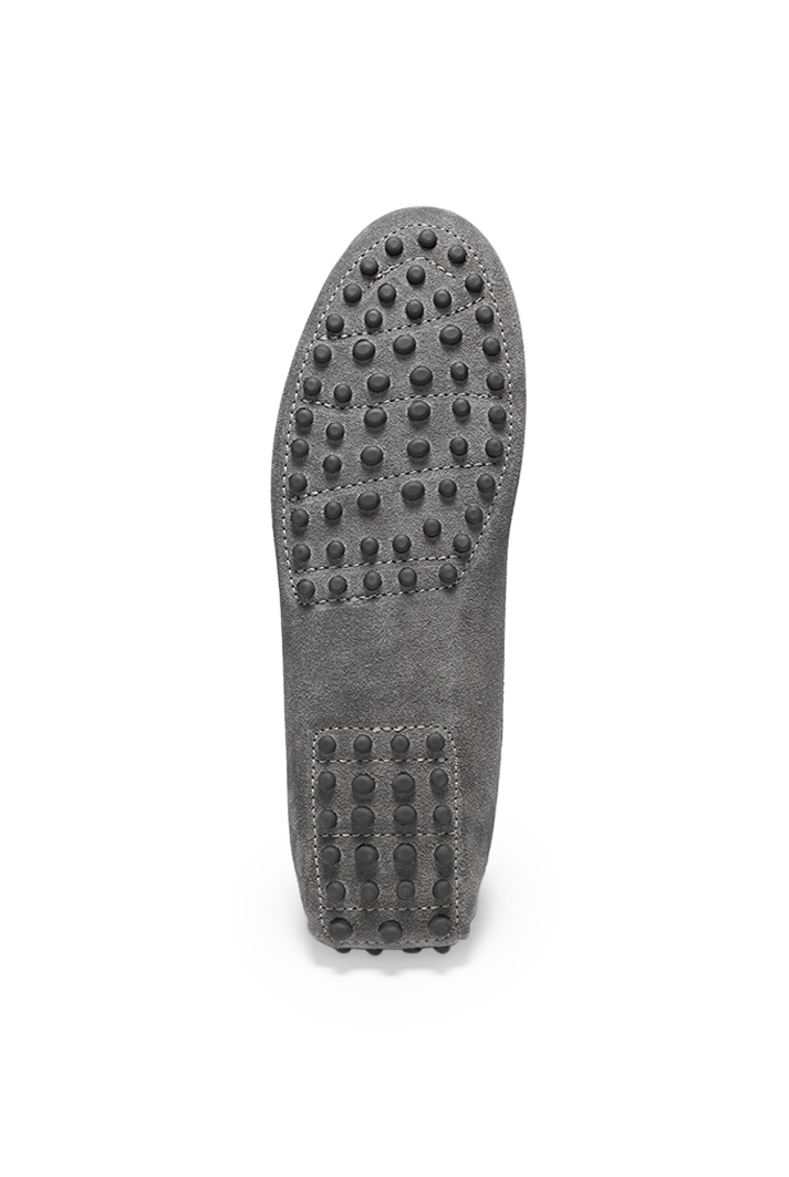 Hugs & Co. slate grey penny loafer driving shoes for women. Moccasin style driving loafers in luxurious grey suede upper and lined with a soft leather for extra comfort. Made in Portugal.